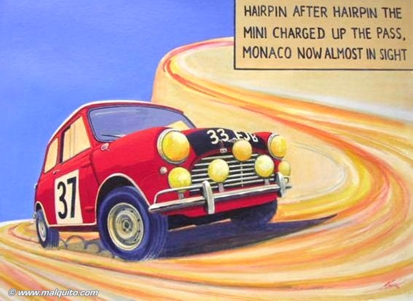 Mini Cooper - Rallye Monte Carlo 1964Acrylique sur papier 300gsm Image: 26 x 36 cm, Papier: 38 x 50 cmRef. 0426
